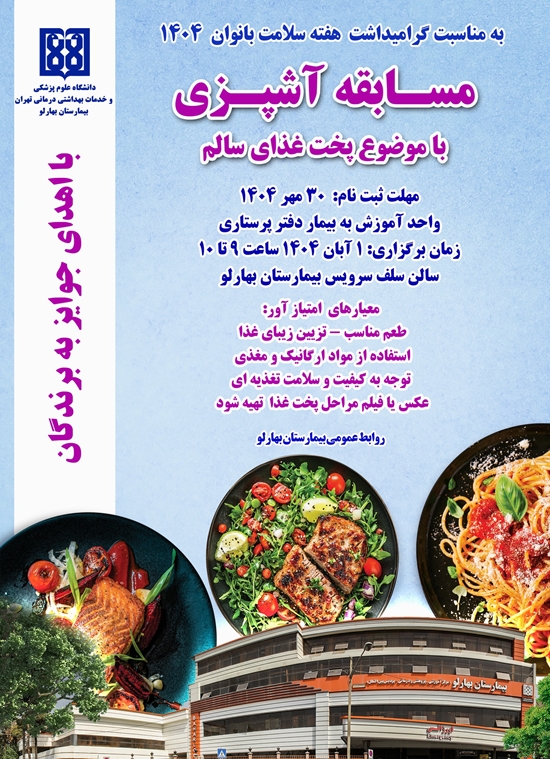 به گزارش روابط عمومی بیمارستان بهارلو، دانشگاه علوم پزشکی تهران، مسابقه آشپزی با محوریت «پخت غذای سالم» روز شنبه ۳ آبانماه ۱۴۰۴ از ساعت ۹ تا ۱۰ صبح در سالن غذاخوری بیمارستان بهارلو برگزار میشود.